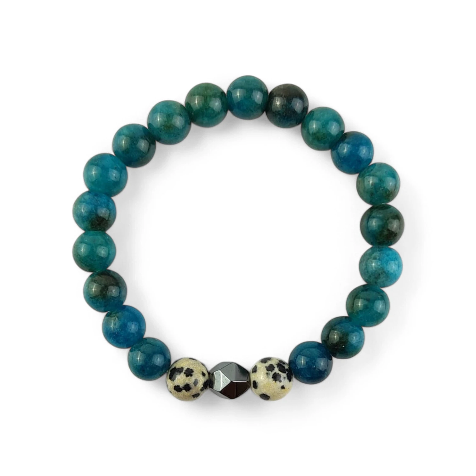 Ręcznie wykonana bransoletka na elastycznej gumce łączy w sobie naturalne piękno kamieni i subtelną elegancję. Każdy koralik 8 mm to apatyt, wspierający klarowność umysłu i rozwój duchowy, uzupełniony koralikaami z jaspisu dalmatyńskiego oraz fasetowanym srebrnym hematytem, który wprowadza równowagę i ochronę energetyczną.