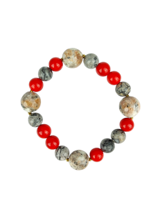 Poznaj siłę ziemskiej energii i stabilnej harmonii w wyjątkowej ręcznie plecionej bransoletce na gumce, wykonanej z naturalnych kamieni: jadeitu brązowego 12 mm, jaspisu Picasso 8 mm oraz jadeitu czerwonego 8 mm, wzbogaconych o eleganckie przekładki ze złotego hematytu.