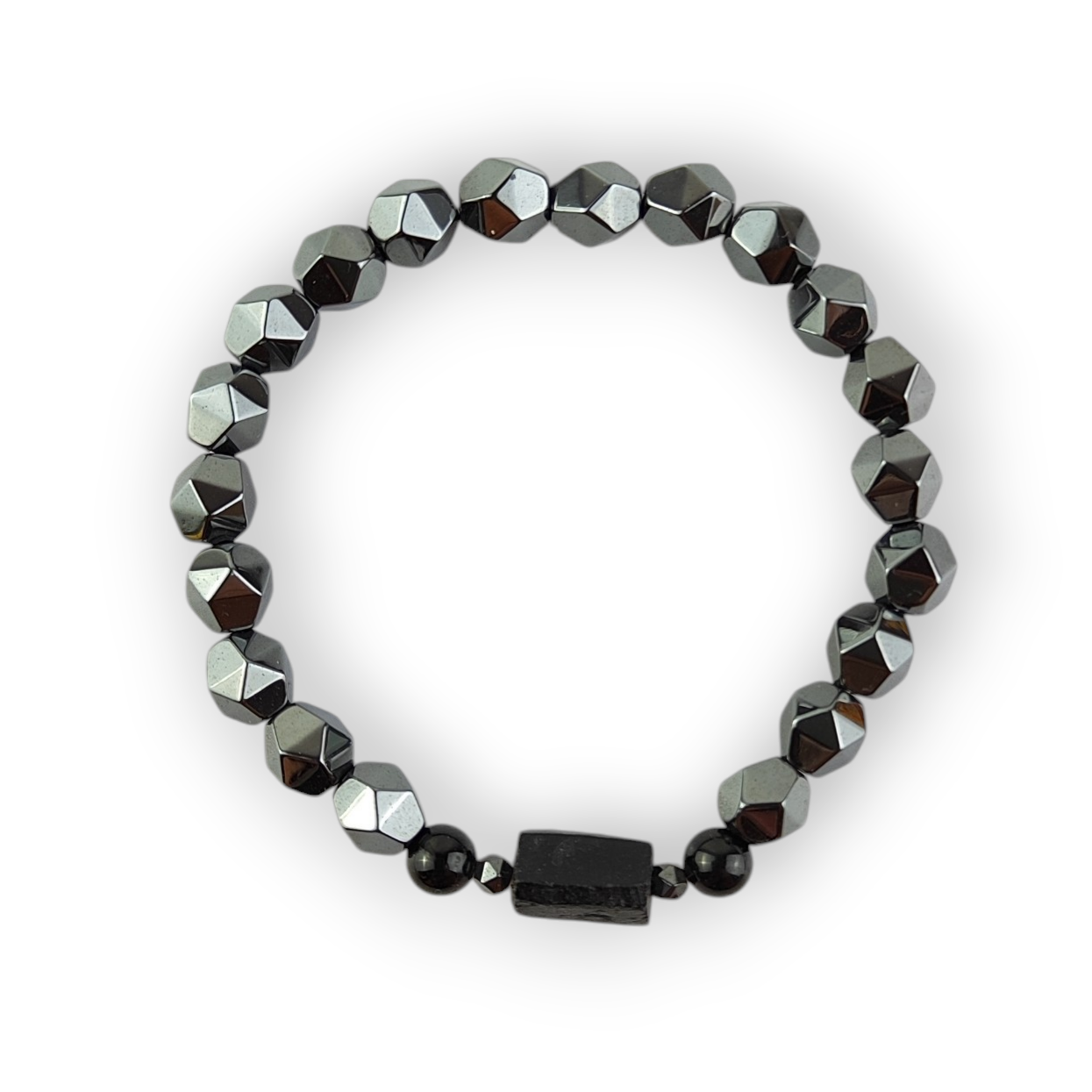 Ręcznie wykonana bransoletka na elastycznej gumce z naturalnych kamieni o średnicy 8 mm. Fasetowany srebrny hematyt pięknie odbija światło, tworząc elegancką, nowoczesną bazę, którą przełamuje surowa bryłka czarnego turmalinu. Całość uzupełniają przekładki z czarnego onyksu, nadając bransoletce głębi i wyrazistego charakteru.