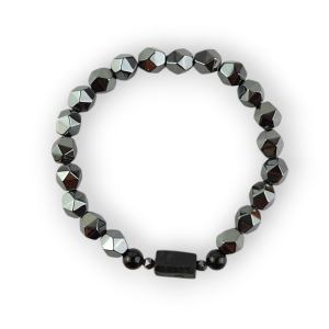 - Hematyt Srebrny (8 mm, fasetowany) – kamień uziemienia i równowagi. Pomaga uporządkować myśli, zwiększa koncentrację i wspiera poczucie stabilności. Działa jak „kotwica”, która pomaga wrócić do tu i teraz. Związany z czakrą podstawy.