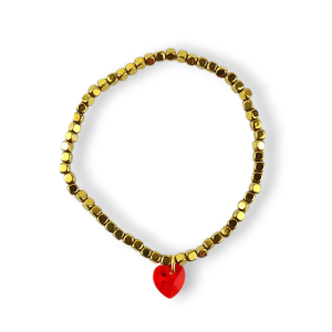 Ręcznie wykonana bransoletka na elastycznej gumce z kostek złotego hematytu, ozdobiona zawieszką w formie szklanego czerwonego serca. To połączenie elegancji i symboliki – minimalistyczna forma spotyka się tu z mocnym akcentem koloru i znaczenia.