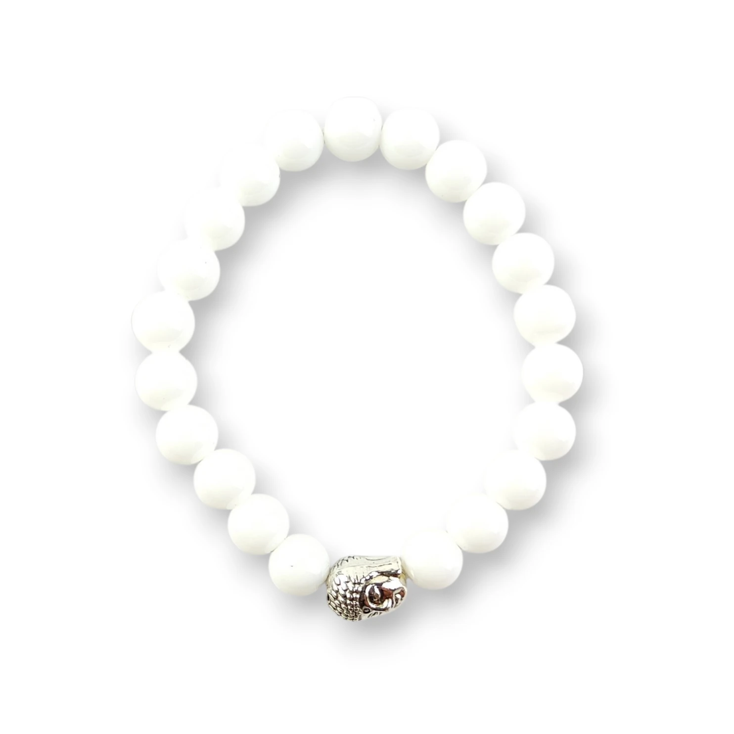 Ręcznie wykonana bransoletka na elastycznej gumce z naturalnych koralików białego jadeitu o średnicy 8 mm, uzupełniona przekładką w formie głowy Buddy. To minimalistyczna, a jednocześnie symboliczna biżuteria, która łączy estetykę z duchowym znaczeniem.