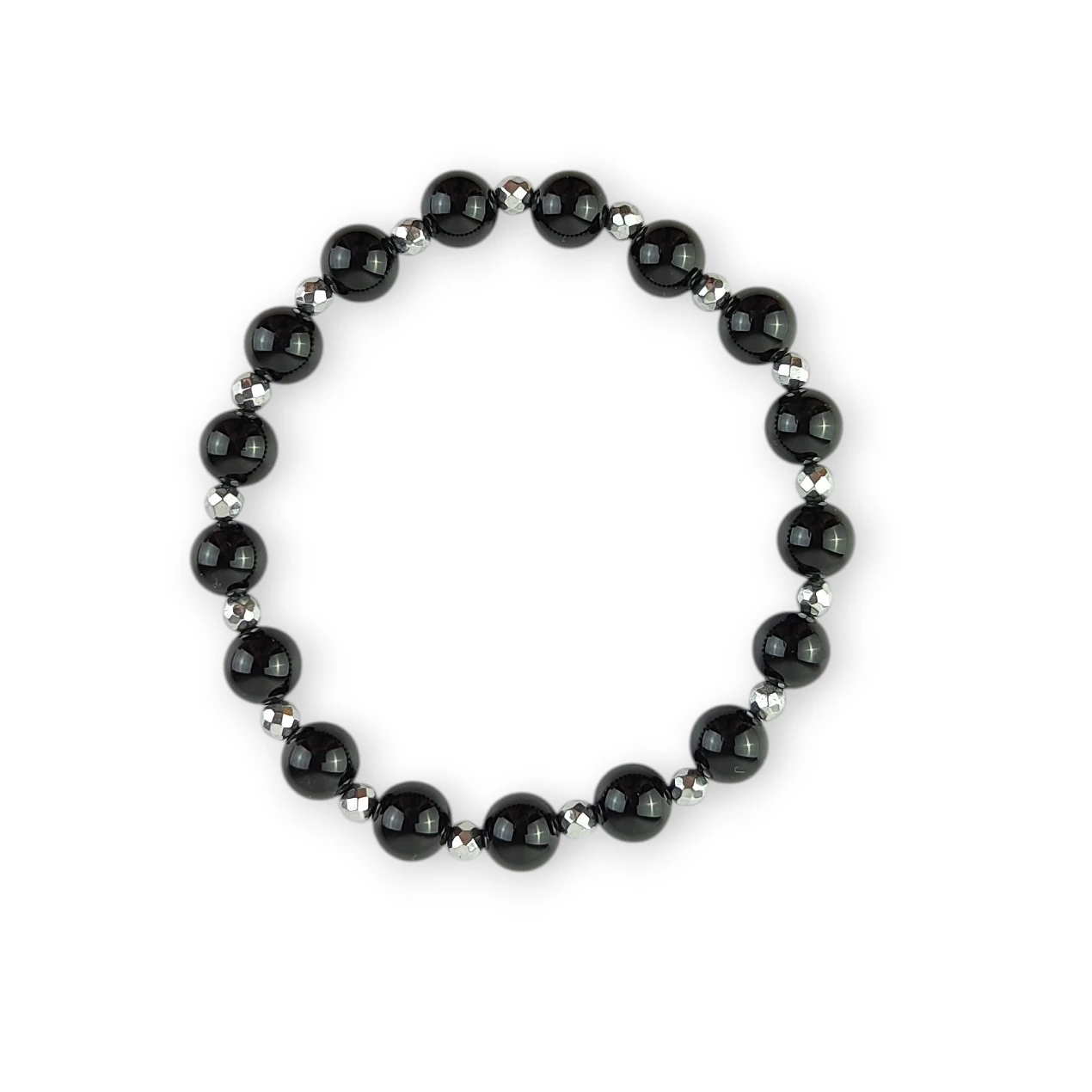 Ręcznie wykonana bransoletka na elastycznej gumce z naturalnych kamieni 8 mm onyksu, przeplatanych fasetowanym srebrnym hematytem. Kontrast głębokiej czerni z metalicznym połyskiem nadaje jej elegancki, ponadczasowy charakter. To minimalistyczna forma, która łączy estetykę z wyraźnym, ochronnym działaniem energetycznym.