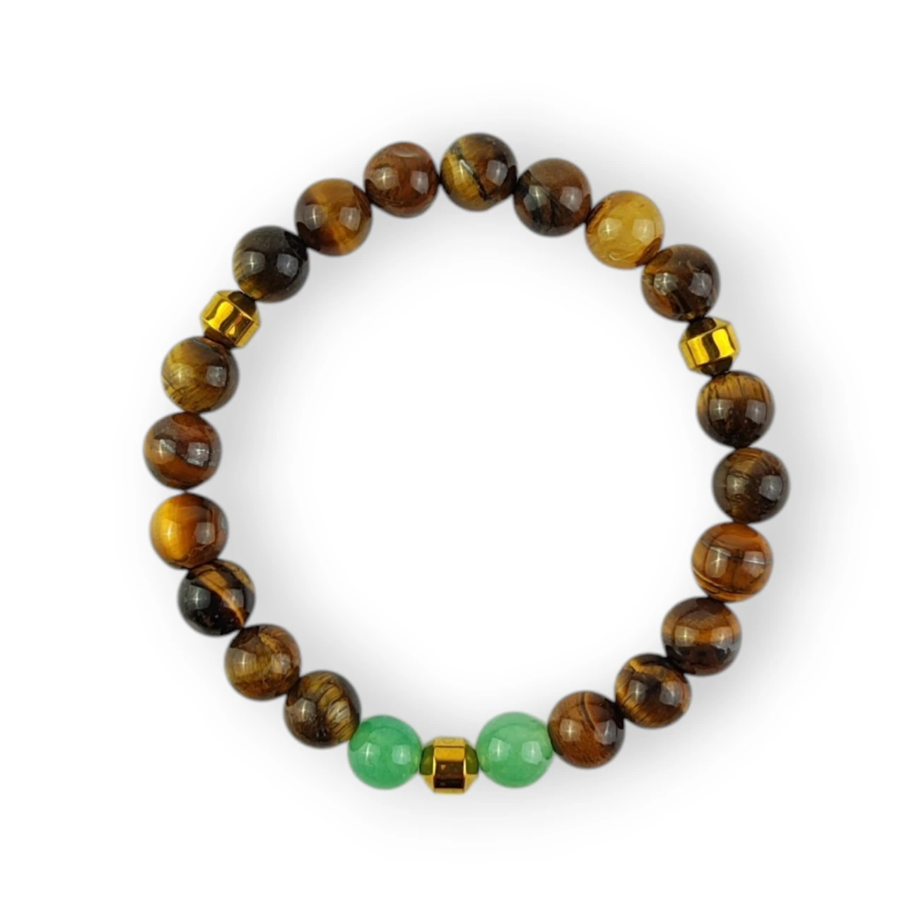 Ręcznie wykonana bransoletka na elastycznej gumce z naturalnych kamieni o średnicy 8 mm. Połączenie ciepłego, złocistego tygrysiego oka z kojącym zielonym awenturynem tworzy harmonijną kompozycję, która łączy energię działania z wewnętrznym spokojem. Całość uzupełniają eleganckie przekładki ze złotego hematytu, dodające subtelnego blasku i wzmacniające energetyczne działanie kamieni.