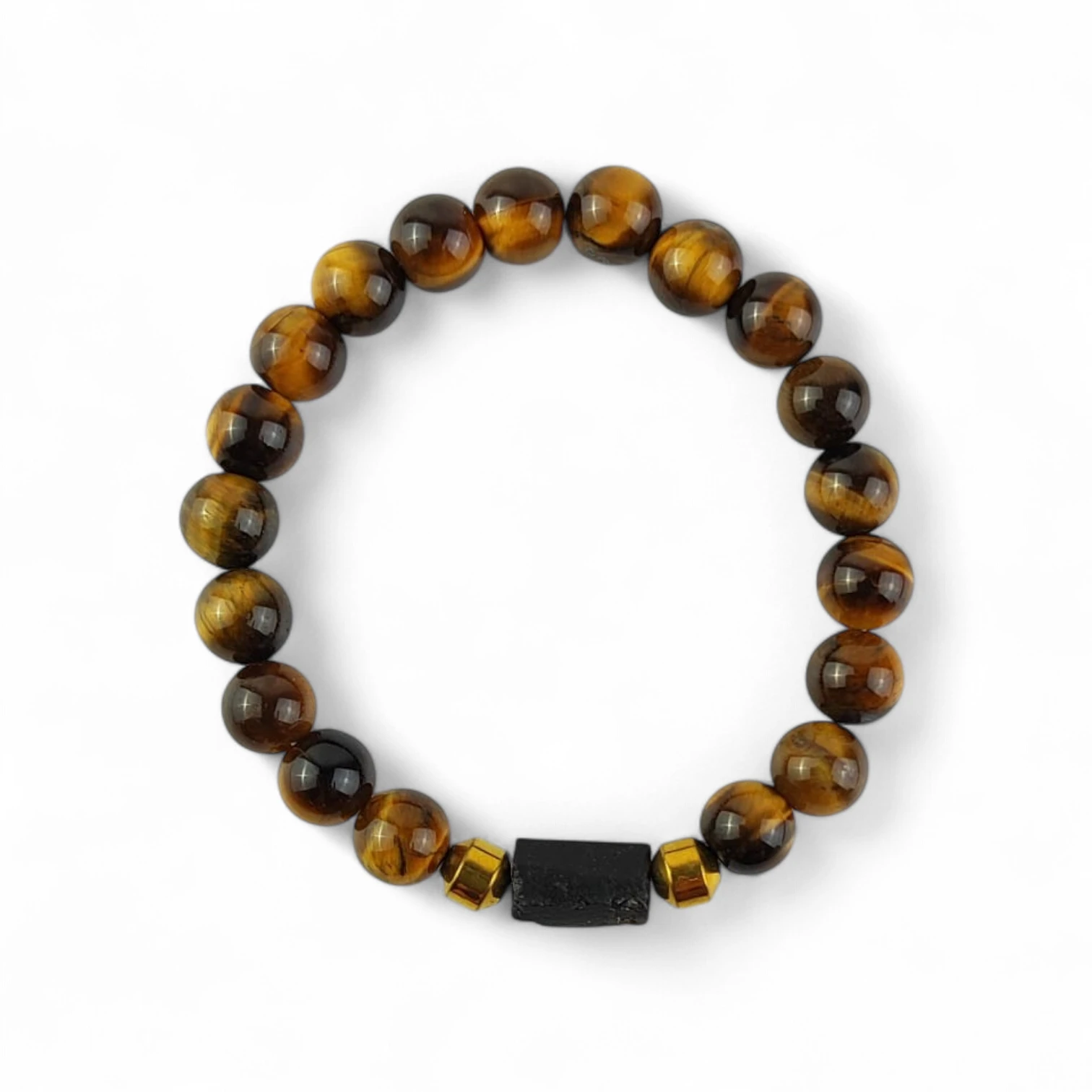 Ręcznie wykonana bransoletka na elastycznej gumce z naturalnych kamieni o średnicy 8 mm. Połączenie złocisto-brązowego tygrysiego oka z surową bryłką czarnego turmalinu tworzy mocną, wyrazistą kompozycję o ochronnym i uziemiającym charakterze. Całość dopełniają eleganckie przekładki ze złotego hematytu, które podkreślają energię kamieni i dodają bransoletce subtelnej elegancji.