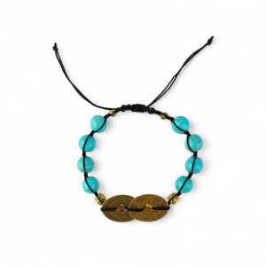 Bransoletka z turkusem i dwiema monetami feng shui to subtelny, a zarazem silny amulet, który wspiera spokój, szczerość, ochronę i przepływ dobrej energii w codziennym życiu. Idealna dla osób ceniących biżuterię z głębszym znaczeniem.