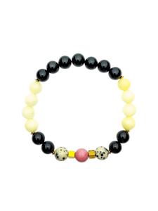 Bransoletka mala z onyksu, jadeitu żółtego i jaspisu dalmatyńskiego to subtelny talizman ochrony, radości i harmonii. Idealna dla osób, które chcą wzmocnić stabilność, otworzyć się na pozytywną energię i zachować równowagę w codziennym życiu.
