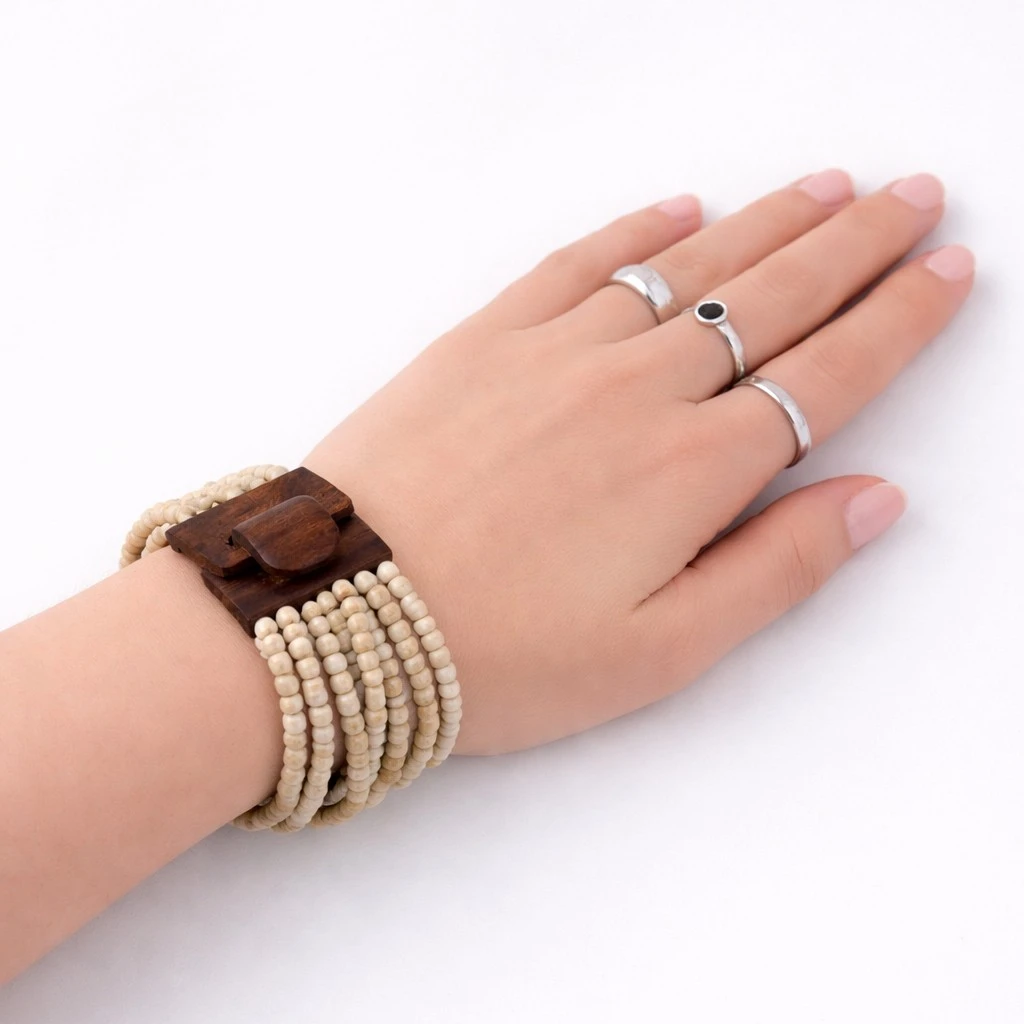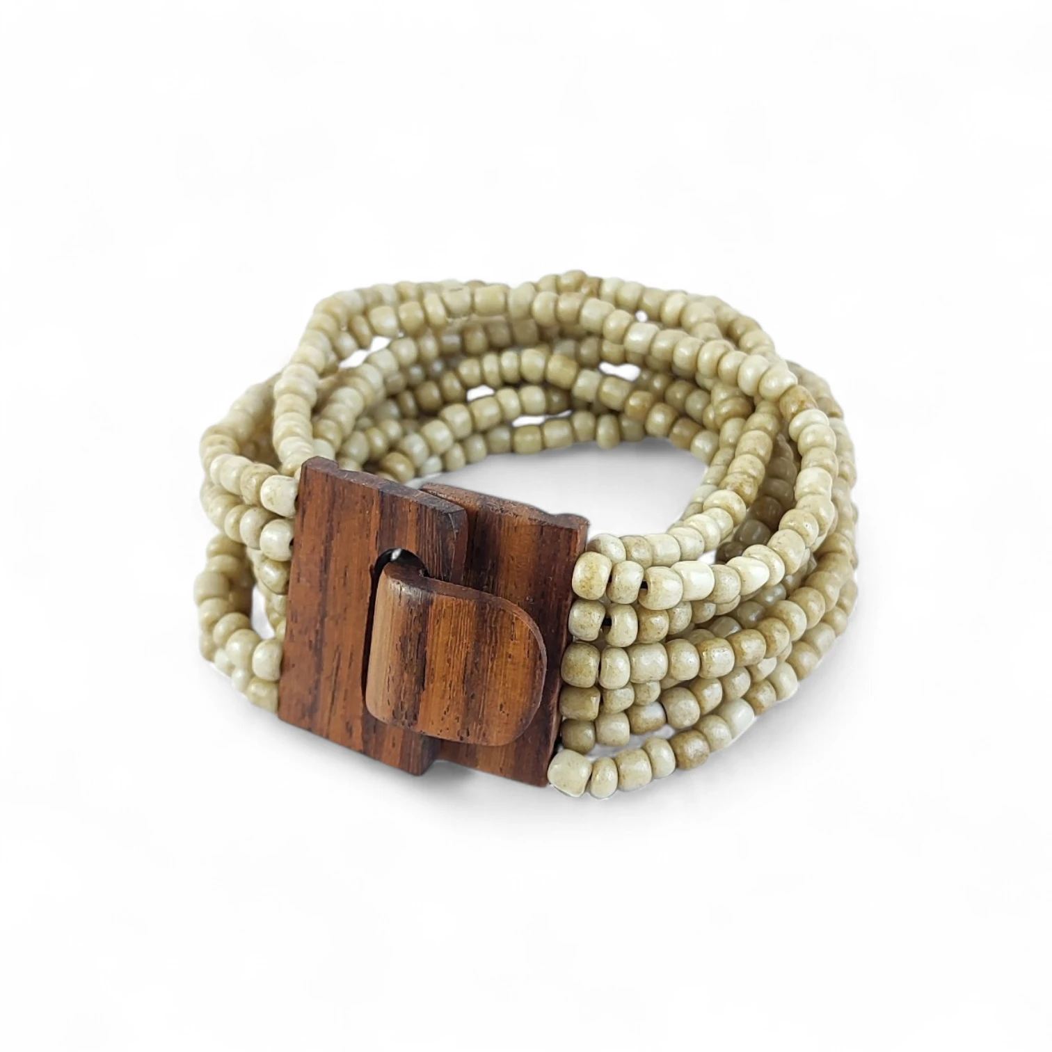 Bransoletka z Koralików Szklanych na Gumce z Drewnianą Klamrą kość słoniowa