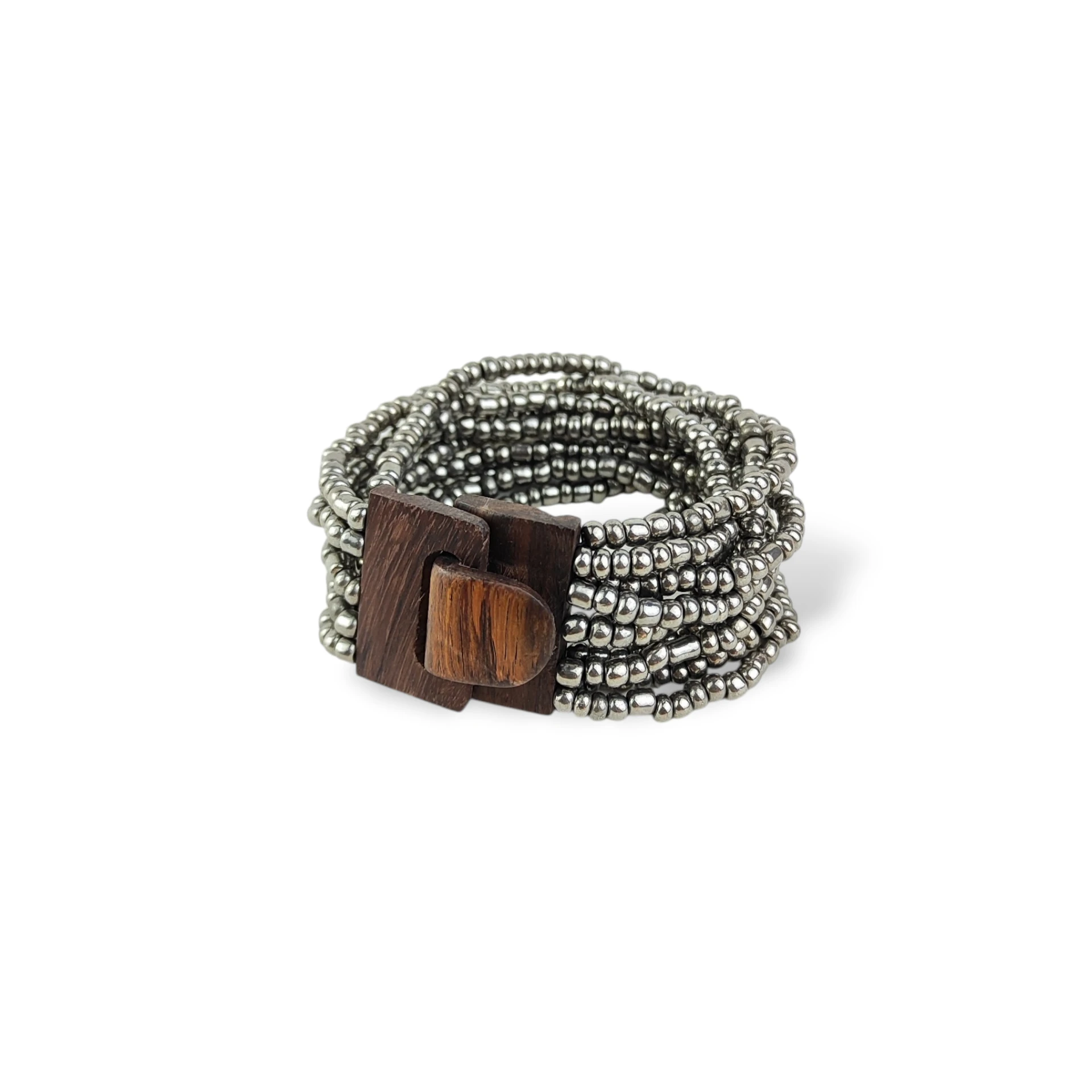 Bransoletka z Koralików Szklanych na Gumce z Drewnianą Klamrą srebrna