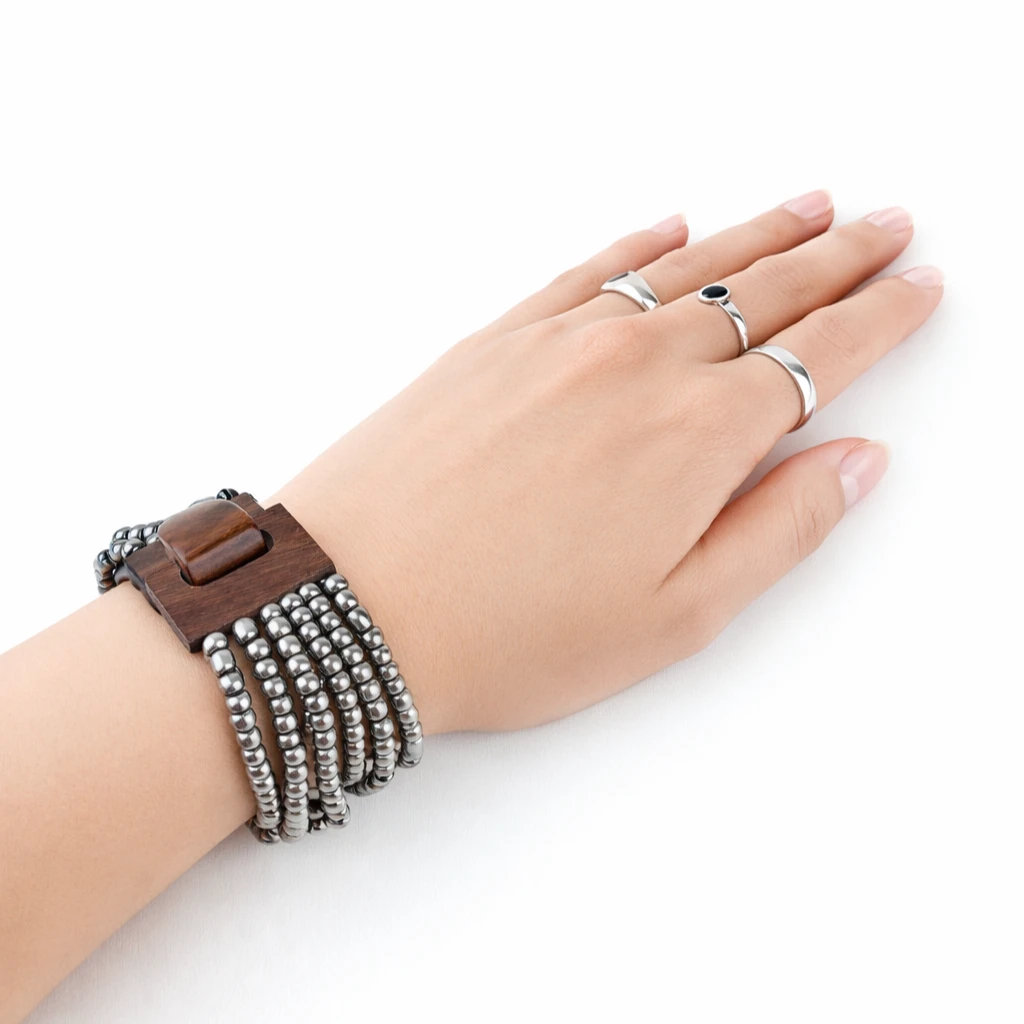 Bransoletka została wykonana na elastycznej gumce, dzięki czemu dobrze dopasowuje się do nadgarstka. Dodatkowym atutem jest ozdobna, otwierana klamra z naturalnego drewna kokosowego, która nadaje całości egzotycznego charakteru i wyróżnia ją spośród klasycznej biżuterii.