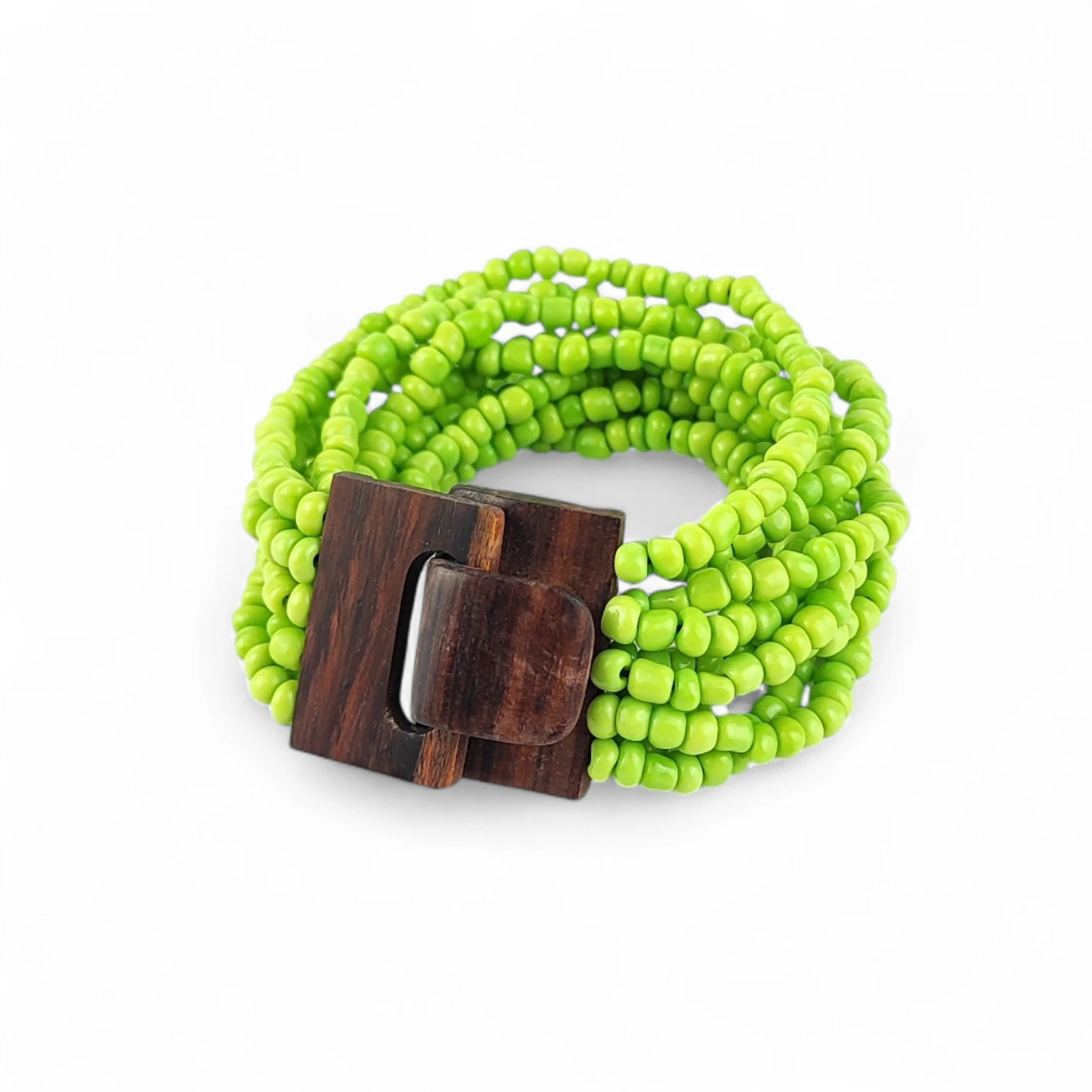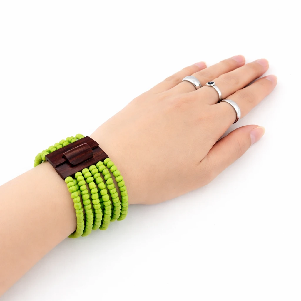 Bransoletka z Koralików Szklanych na Gumce z Drewnianą Klamrą zielona