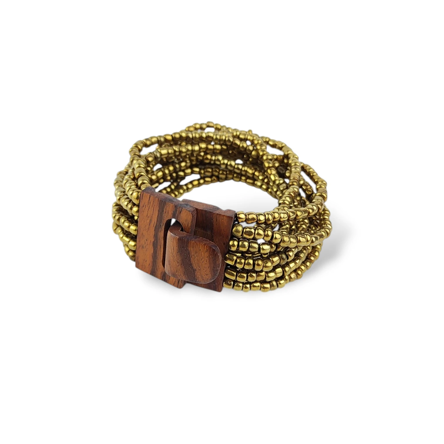 Bransoletka z Koralików Szklanych na Gumce z Drewnianą Klamrą złota