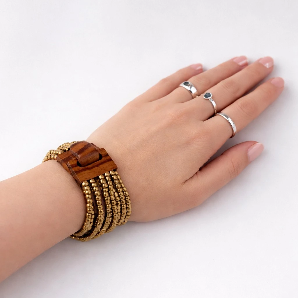 Bransoletka została wykonana na elastycznej gumce, dzięki czemu dobrze dopasowuje się do nadgarstka. Dodatkowym atutem jest ozdobna, otwierana klamra z naturalnego drewna kokosowego, która nadaje całości egzotycznego charakteru i wyróżnia ją spośród klasycznej biżuterii.