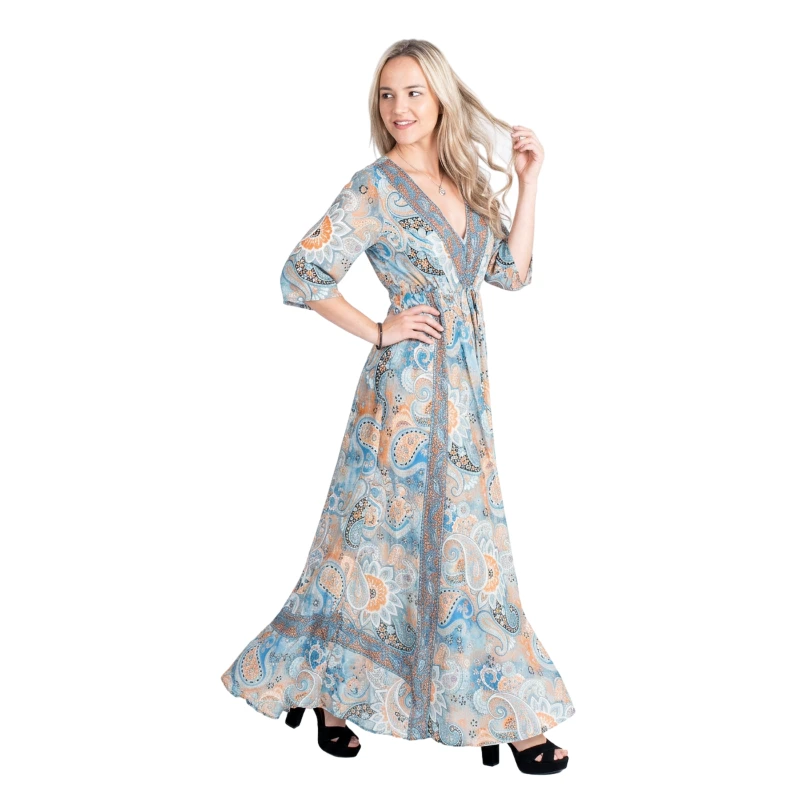 Ta długa sukienka w odcieniach jasnego błękitu to idealna propozycja na lato – lekka, kobieca i pełna swobodnego, boho klimatu. Delikatny wzór w jasnych kolorach pięknie komponuje się z pastelowym tłem, tworząc subtelny i świeży look.