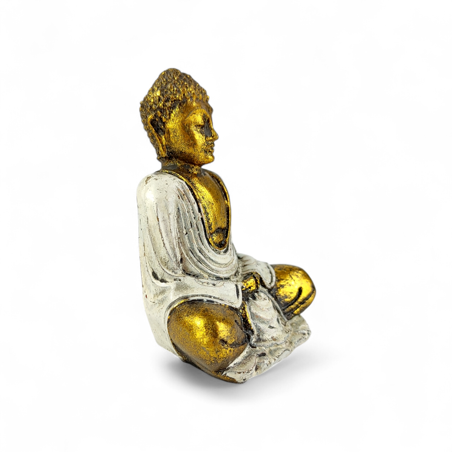 Elegancka figurka Buddy wykonana z trwałej żywicy, utrzymana w stylu antycznym i ręcznie malowana z dbałością o detale.