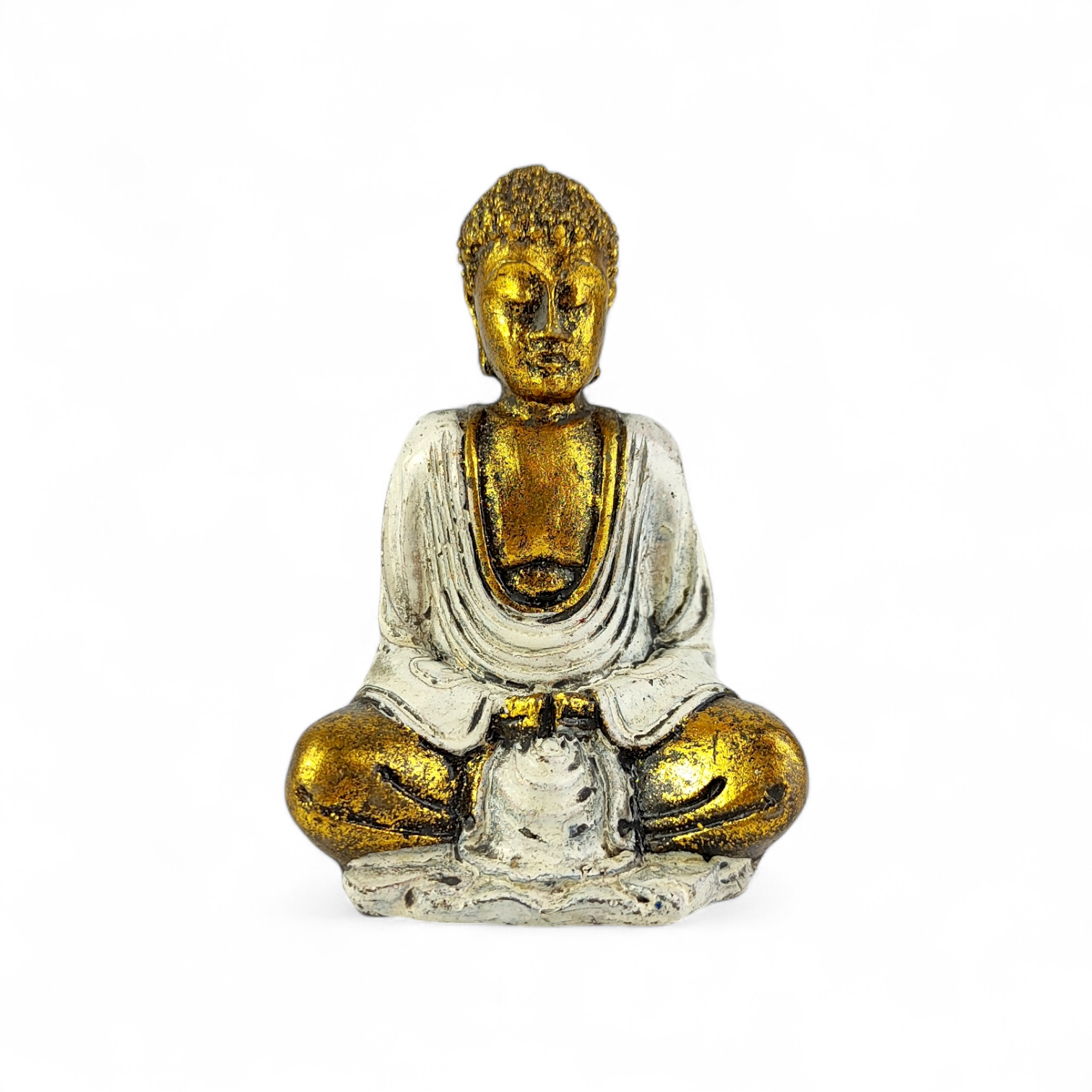 Figurka przedstawia Buddę w pozycji medytacyjnej, która od wieków symbolizuje spokój, równowagę i wewnętrzne wyciszenie. Starannie wykonane zdobienia oraz efekt postarzenia podkreślają orientalny styl i nadają całości unikalny wygląd.