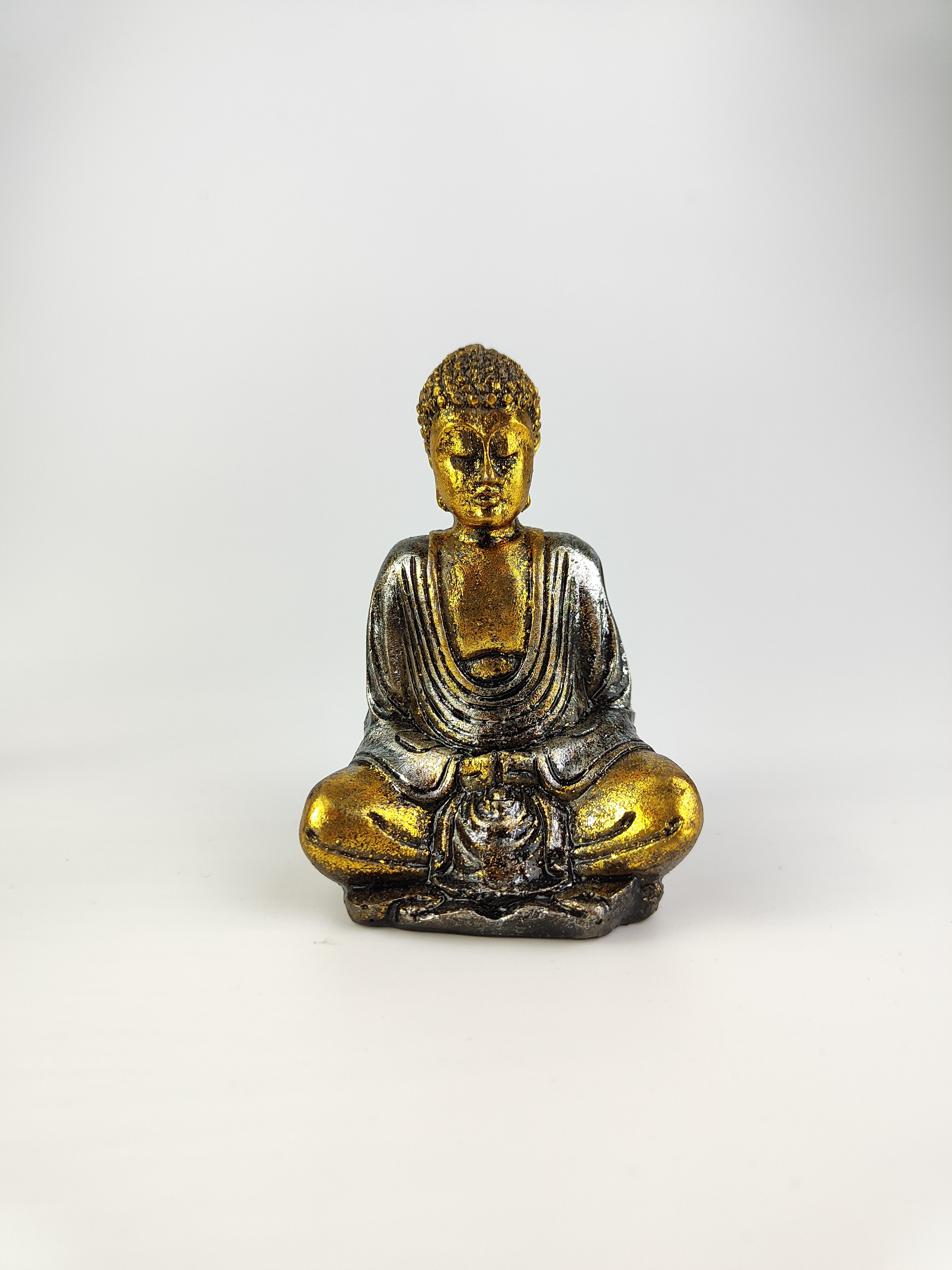 Figurka przedstawia Buddę w pozycji medytacyjnej, która od wieków symbolizuje spokój, równowagę i wewnętrzne wyciszenie. Starannie wykonane zdobienia oraz efekt postarzenia podkreślają orientalny styl i nadają całości unikalny wygląd.
