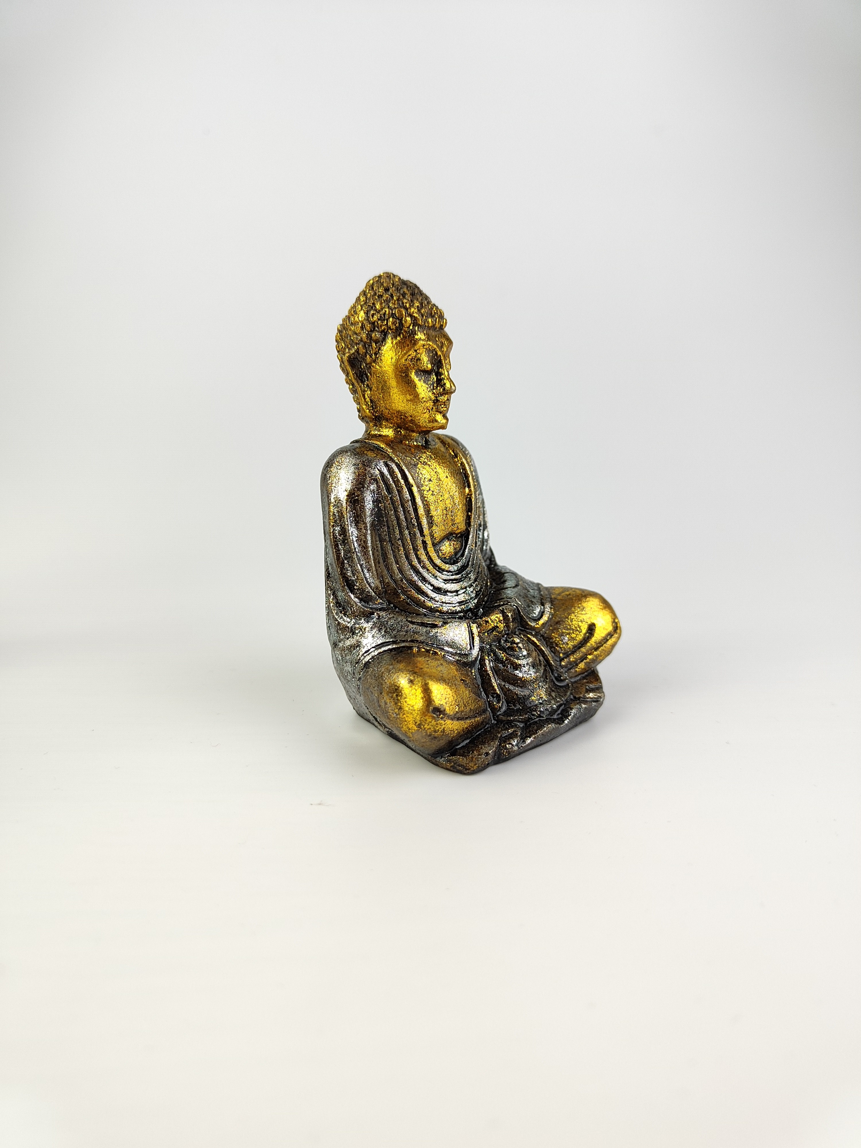 Elegancka figurka Buddy wykonana z trwałej żywicy, utrzymana w stylu antycznym i ręcznie malowana z dbałością o detale.