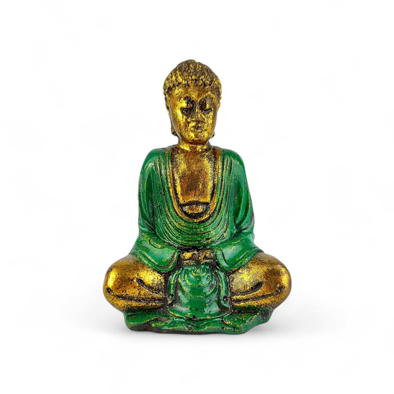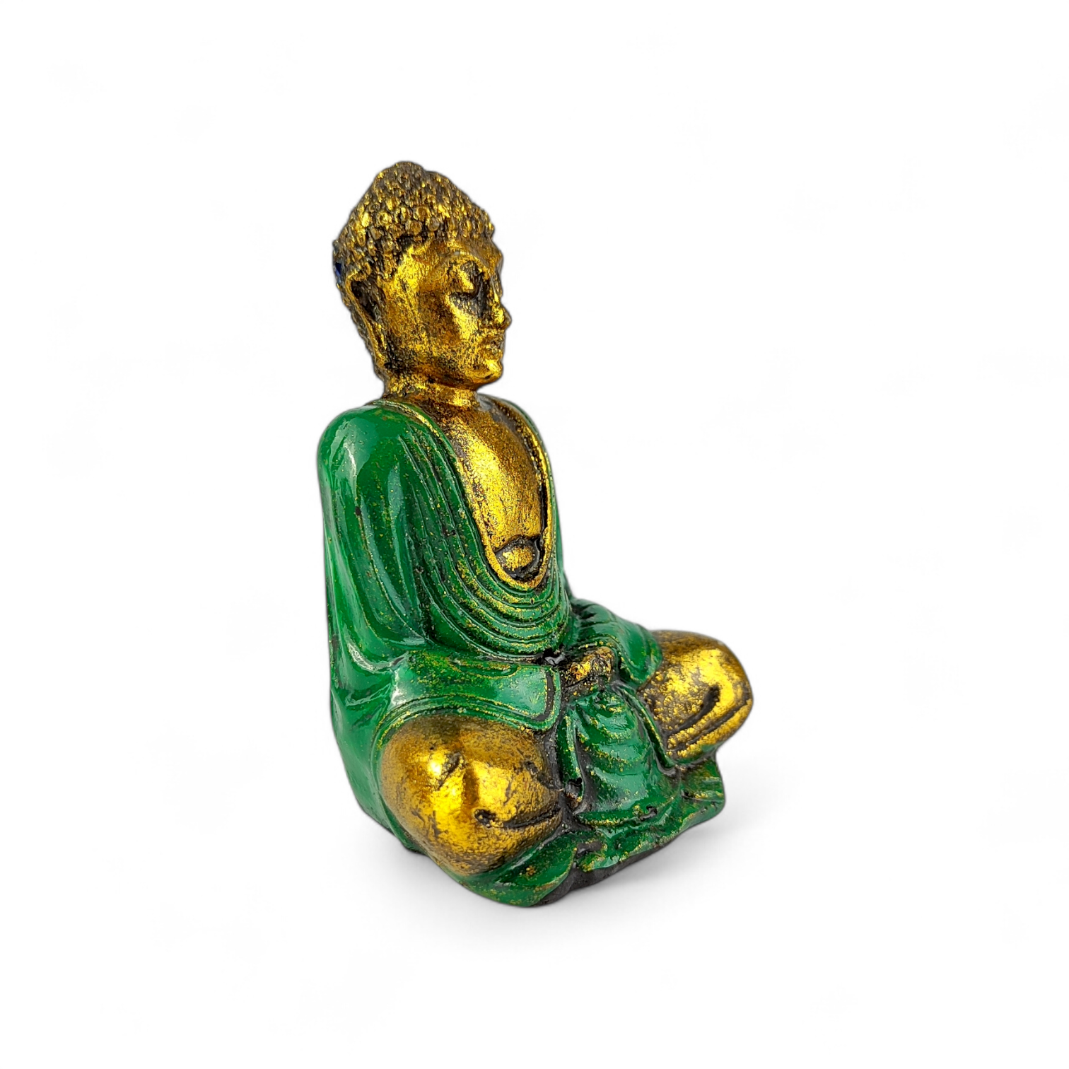 Połączenie zielonych i złotych zdobień nadaje figurce wyjątkowego charakteru i sprawia, że pięknie prezentuje się jako dekoracja wnętrza oraz symbol duchowej harmonii.