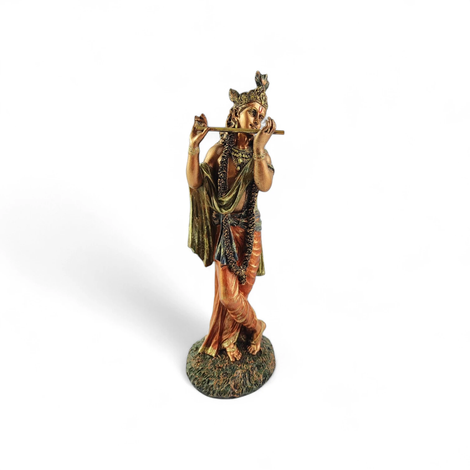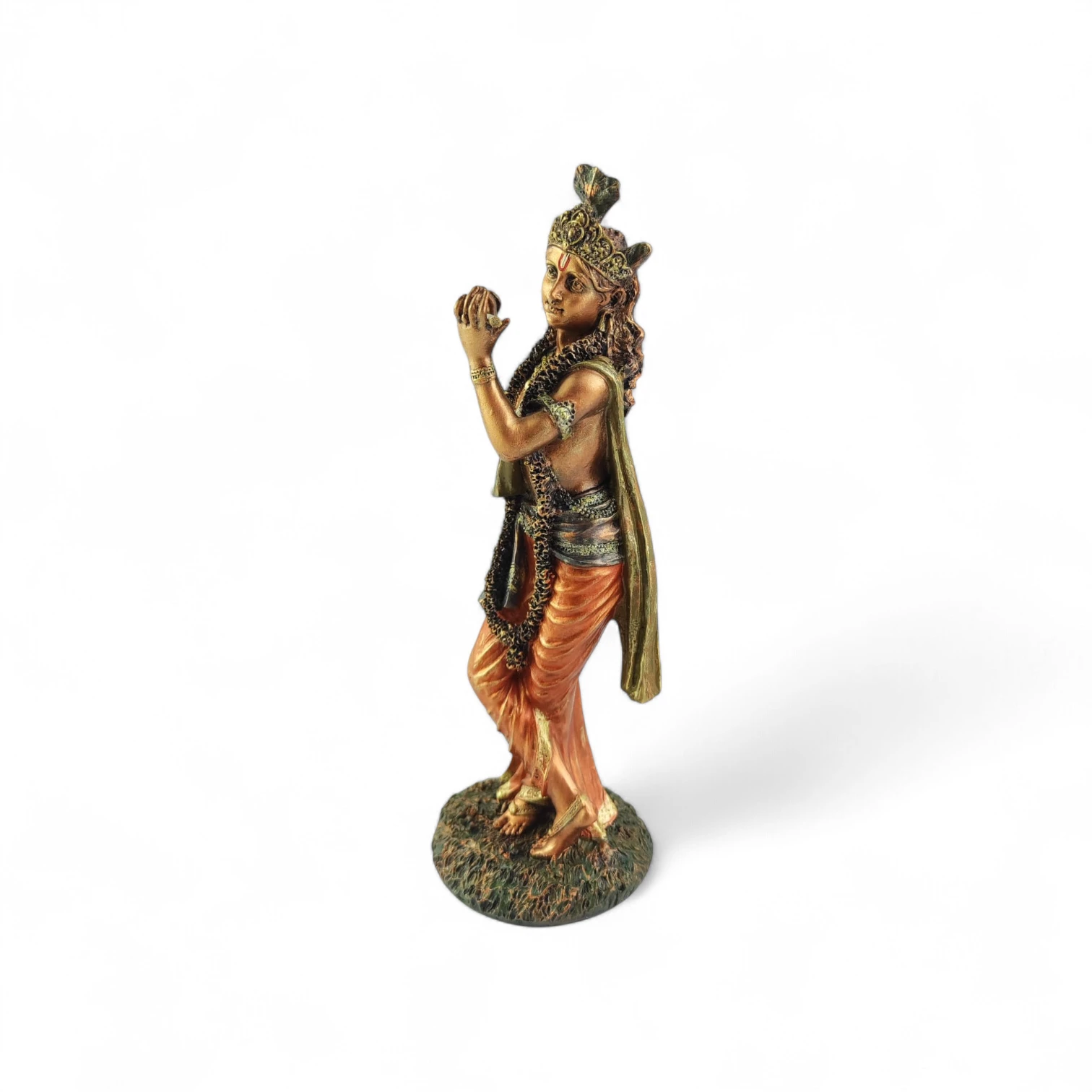 Figurka wyróżnia się delikatną, artystyczną formą. Krishna w złotym wydaniu i jego ręczne malowanie podkreśla detale – od stroju, przez biżuterię, aż po instrument. Całość tworzy elegancki i lekko egzotyczny efekt.