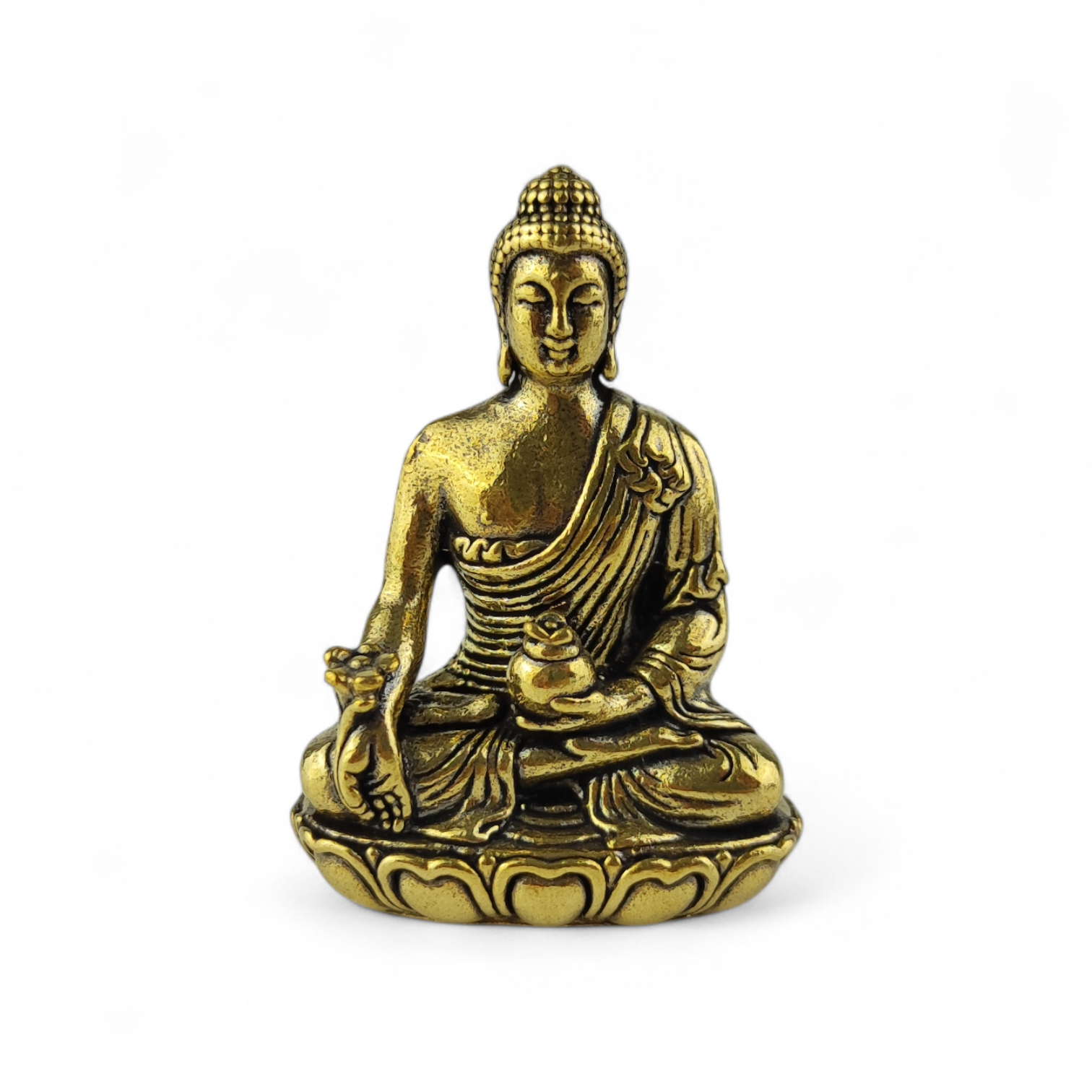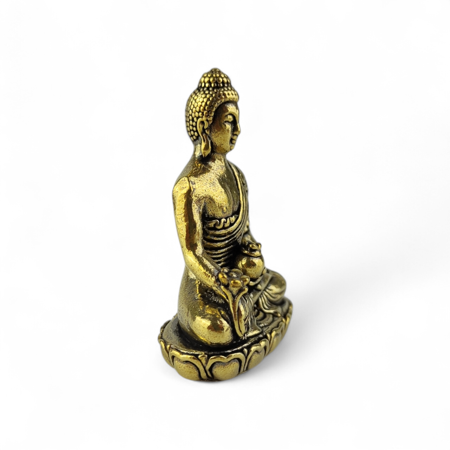 Małe mosiężne figurki przedstawiają Buddę w pozie medytacyjnej w klasycznyzłotym stylu, który podkreśla jego boską elegancję.