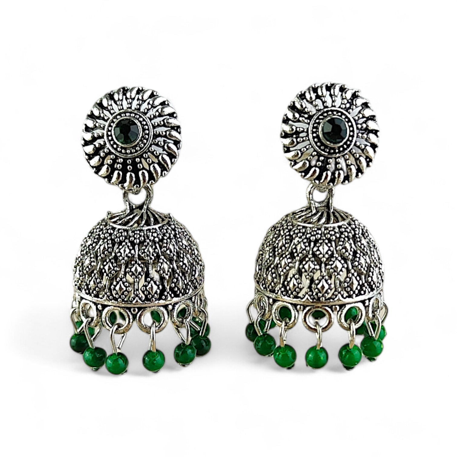 Tradycyjne kolczyki etniczne jhumka (jhumki) w kolorze srebrnym to ponadczasowa biżuteria inspirowana kulturą Azji Południowej. Charakterystyczny dzwoneczkowy kształt oraz bogate zdobienia sprawiają, że kolczyki przyciągają wzrok i nadają stylizacji wyrazisty, orientalny charakter.