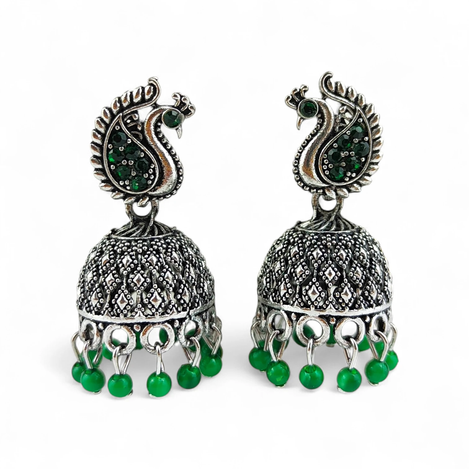 Tradycyjne kolczyki etniczne jhumka (jhumki) w kolorze srebrnym to ponadczasowa biżuteria inspirowana kulturą Azji Południowej. Charakterystyczny dzwoneczkowy kształt oraz bogate zdobienia sprawiają, że kolczyki przyciągają wzrok i nadają stylizacji wyrazisty, orientalny charakter.
