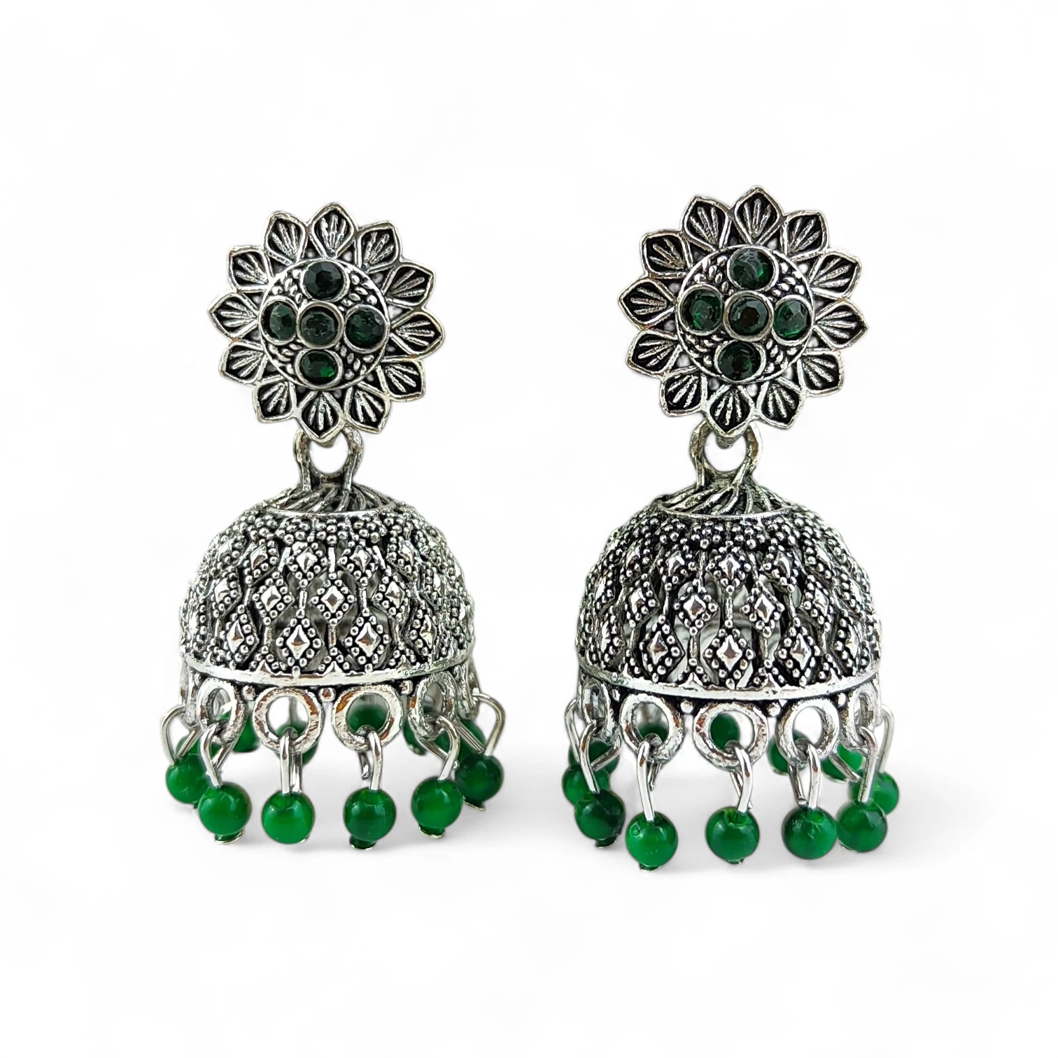 Tradycyjne kolczyki etniczne jhumka (jhumki) w kolorze srebrnym to ponadczasowa biżuteria inspirowana kulturą Azji Południowej. Charakterystyczny dzwoneczkowy kształt oraz bogate zdobienia sprawiają, że kolczyki przyciągają wzrok i nadają stylizacji wyrazisty, orientalny charakter.