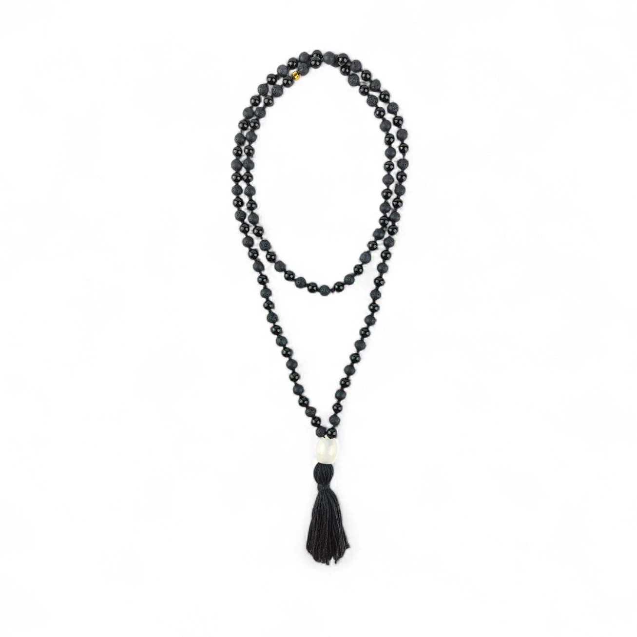 Ręcznie wykonana mala składająca się ze 108 koralików o średnicy 8 mm, stworzona z onyksu i lawy wulkanicznej, przeplatanych po każdym koraliku dla zachowania rytmu i harmonii. Całość wykończona została kamieniem guru z kamienia księżycowego oraz czarnym chwostem, który podkreśla jej minimalistyczny, a zarazem głęboki charakter. Naszyjnik osadzony jest na wytrzymałym czarnym sznurku, idealnym do codziennego noszenia i praktyki medytacyjnej.
