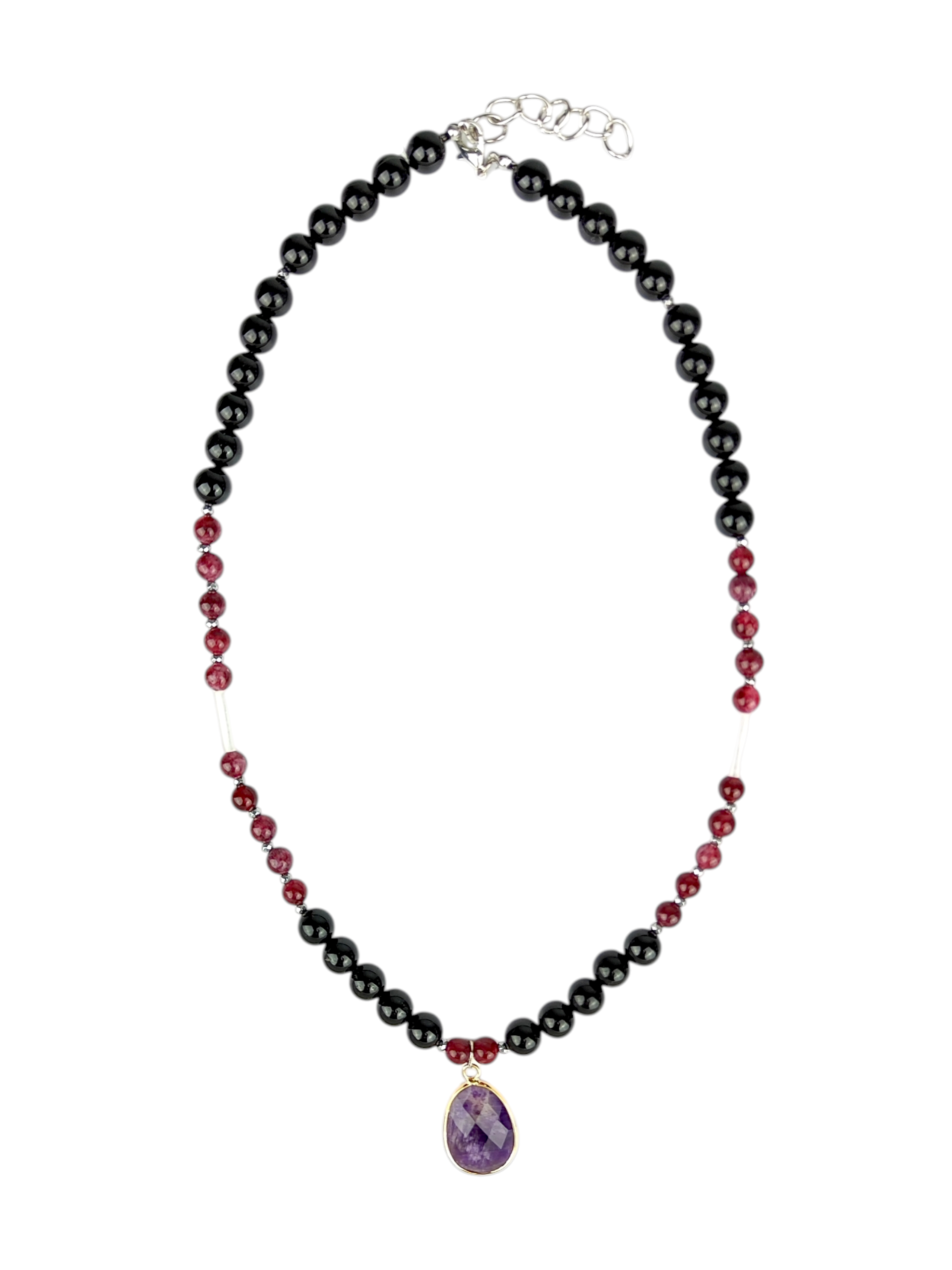 Turmalin 8 mm wspiera ochronę energetyczną i równowagę, granat 6 mm dodaje odwagi i witalności, a elementy z kwarcu różowego wzmacniają serce, miłość własną i harmonię relacji. Wisior w kształcie łezki z ametystu pomaga wyciszyć umysł, wspiera intuicję oraz otwiera czakrę korony i trzeciego oka.