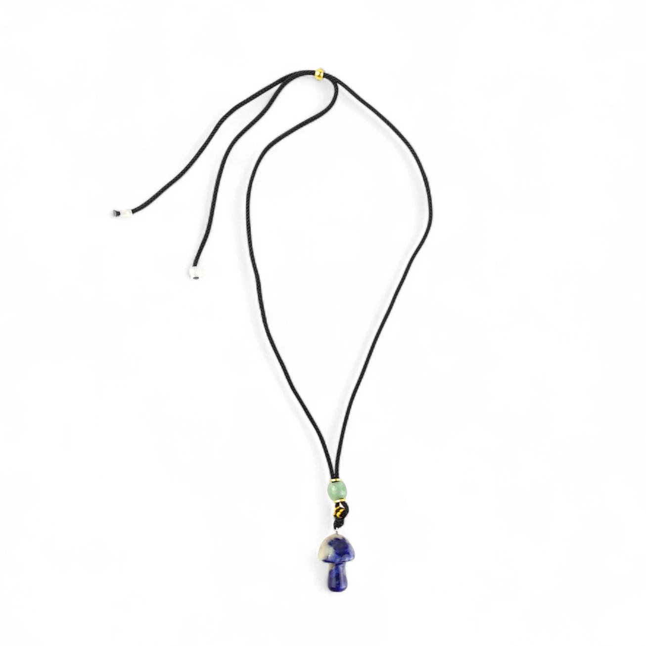 Ręcznie wykonany naszyjnik na regulowanym sznurku to wyjątkowe połączenie natury i symboliki. Koralik z awenturynu zestawiony z wisiorkiem w kształcie grzybka z lapis lazuli tworzy niebanalną, przyciągającą uwagę kompozycję o lekko magicznym charakterze.