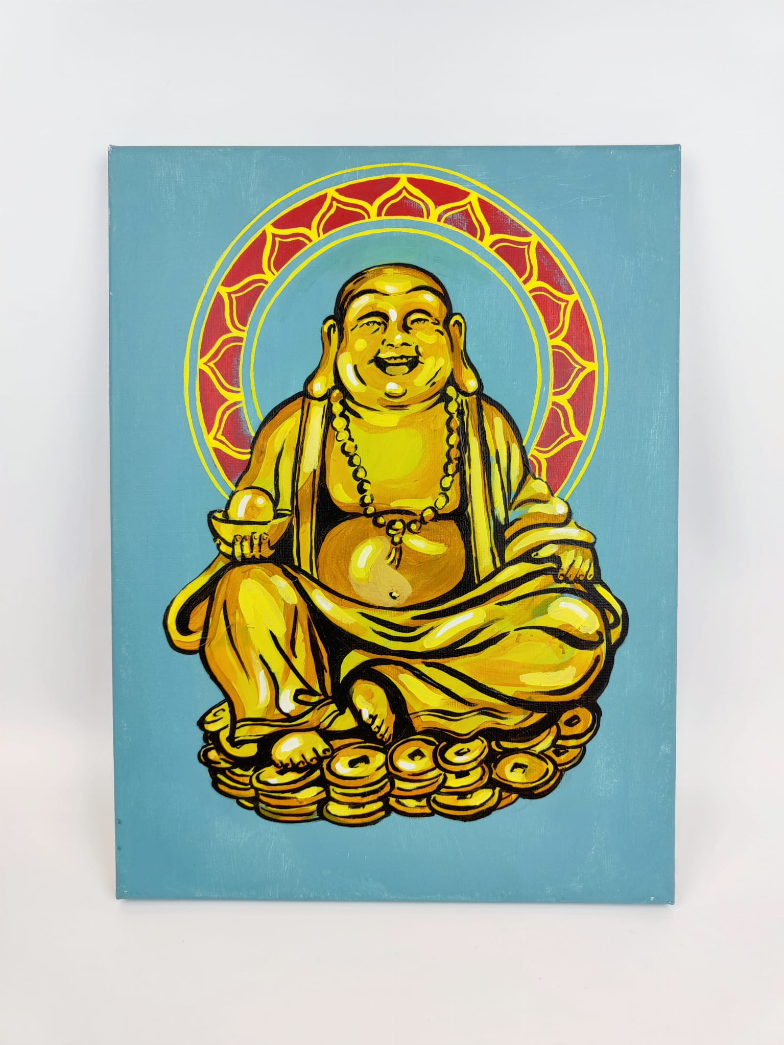Obraz Śmiejacego sie Buddy namalowany w autorskiej technice, łączący farby akrylowe oraz akrylowe pisaki.