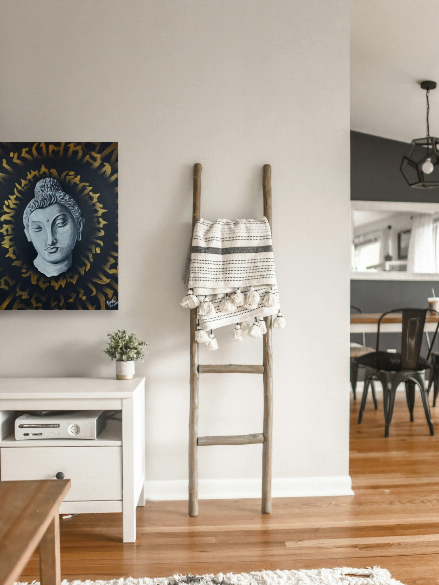 Obraz Budda namalowany w autorskiej technice, łączący farby akrylowe oraz strukturalne farby. Głowa jest wypukła dając efekt 3D.
