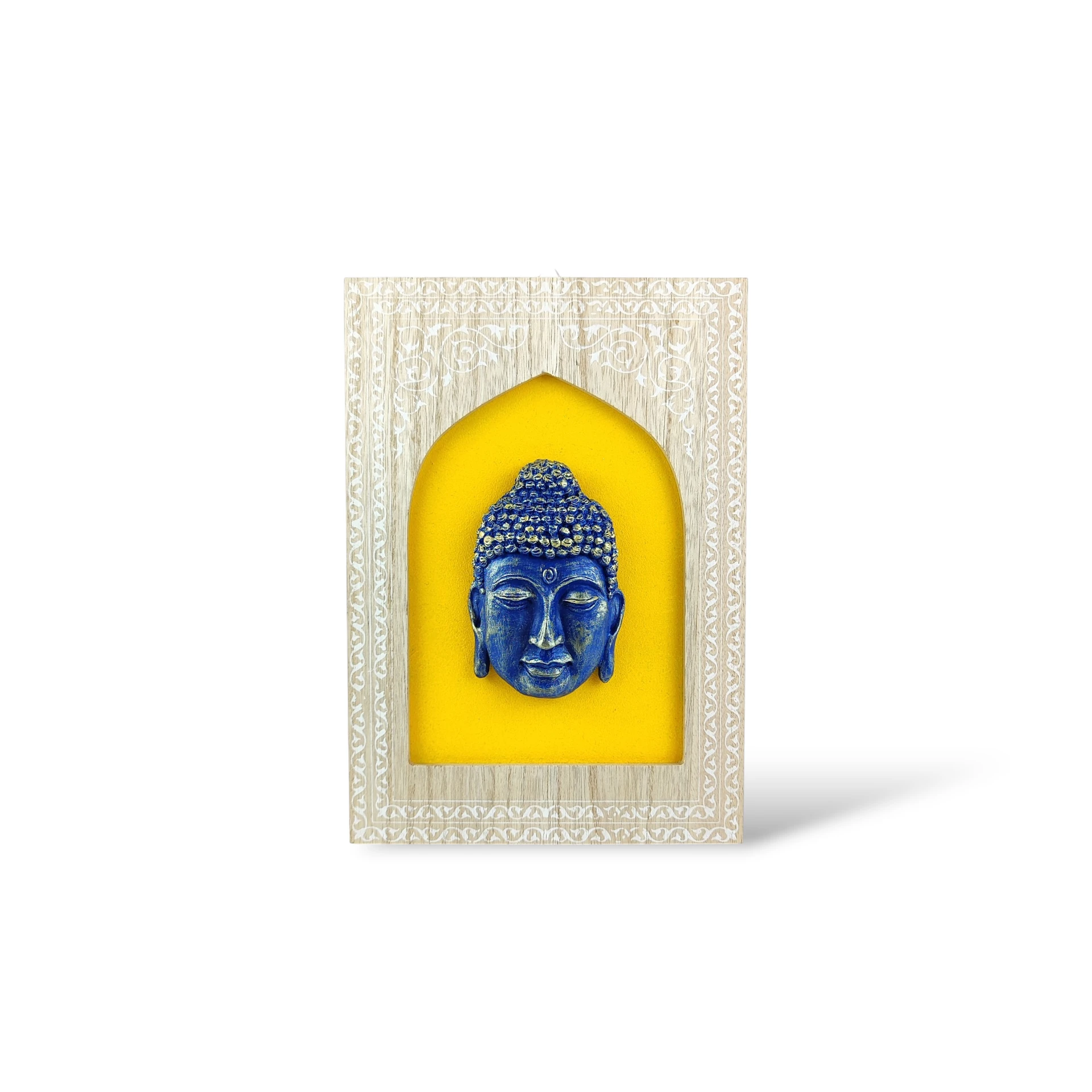 Centralnym elementem jest twarz Buddy w intensywnym, głębokim odcieniu niebieskiego, osadzona na kontrastowym, ciepłym tle. To zestawienie kolorów nadaje całości wyrazistości, a jednocześnie zachowuje harmonię i balans. Subtelna faktura gipsu i ręczne wykończenie sprawiają, że każda sztuka ma swój indywidualny charakter.