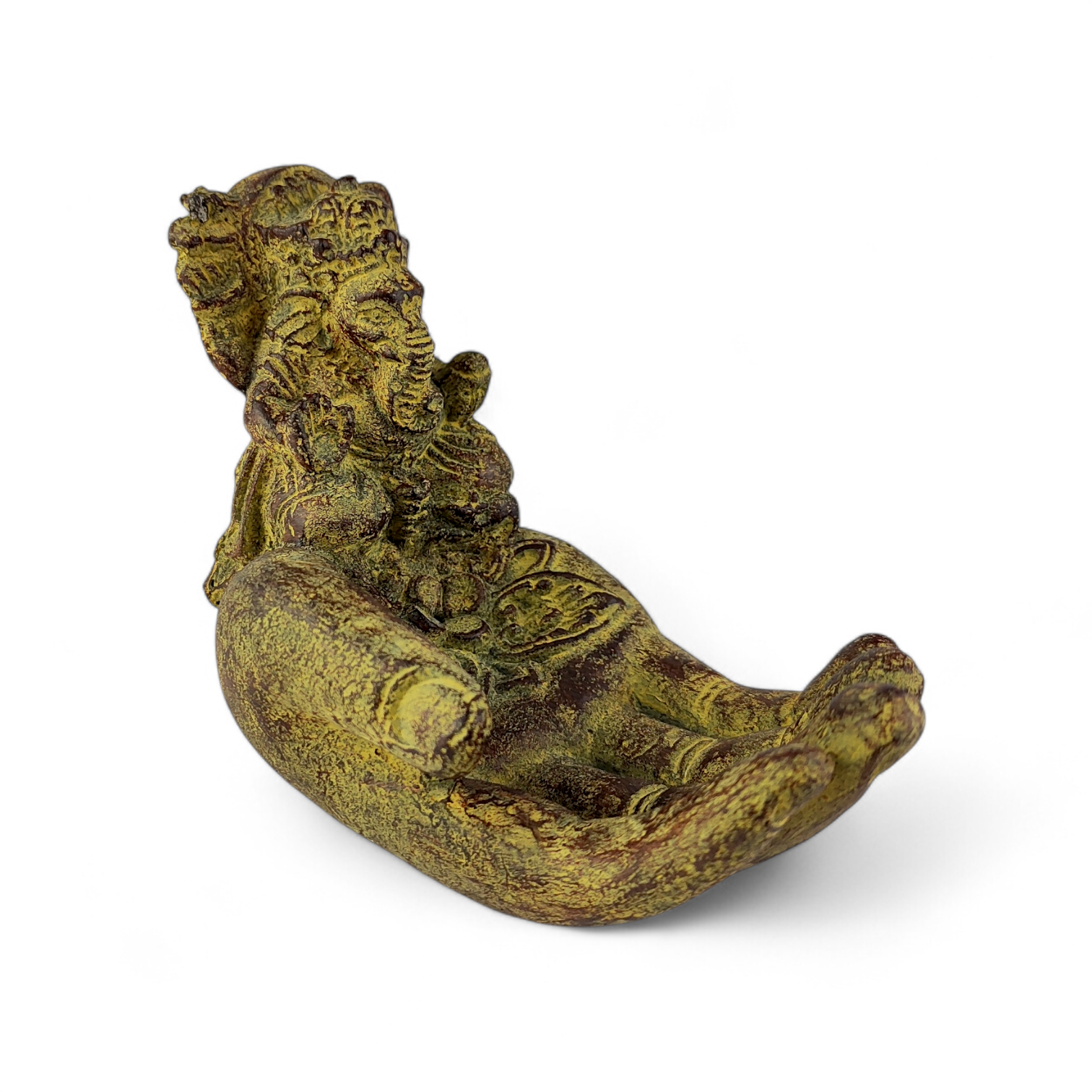 Ganesha, znany jako usuwający przeszkody i patron nowych początków, wnosi do przestrzeni energię ochrony, mądrości i pomyślności. Motyw dłoni symbolizuje opiekę i bezpieczeństwo, a całość tworzy mocny, a jednocześnie spokojny akcent do miejsca medytacji, jogi lub codziennych rytuałów z kadzidłem.