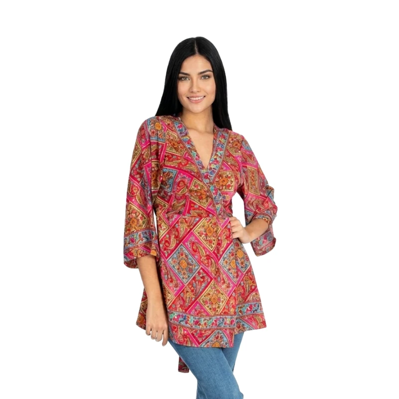 Ta wyjątkowa bluzka z jedwabiu to połączenie kobiecego kroju i wygody, którą docenisz na co dzień i na specjalne okazje. Delikatny, rózowy wzór w stylu paisley nadaje jej lekkości i charakteru, a krój pozwala dopasować ją dokładnie tak, jak lubisz.