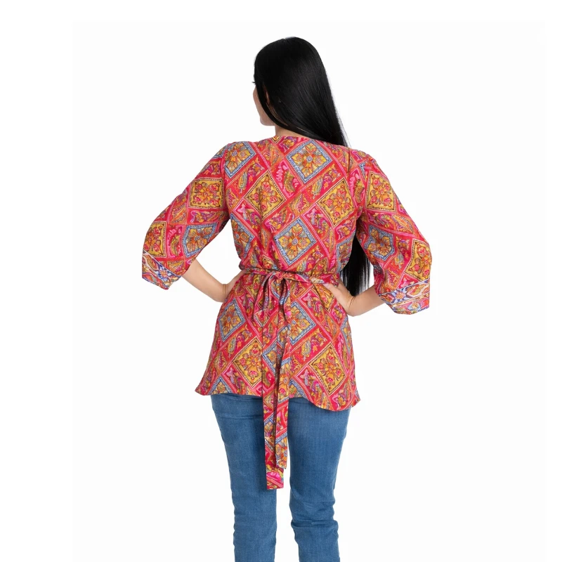 Rózowa wiązana kopertowa bluzka jedwabna boho S/M