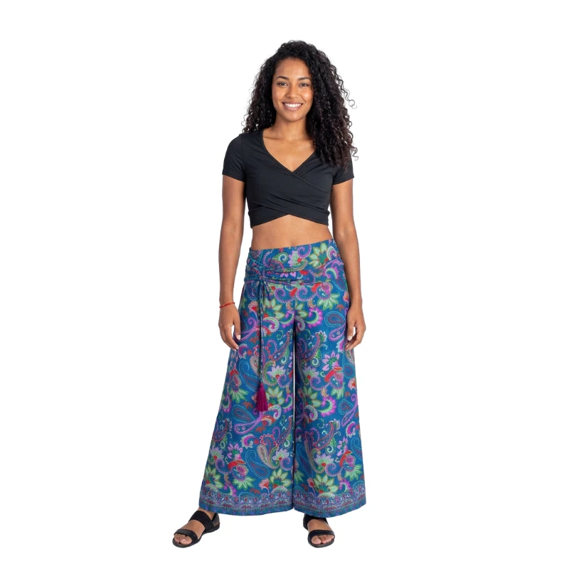 Spodnie wzorzyste niebieskie boho palazzo z jedwabiu
